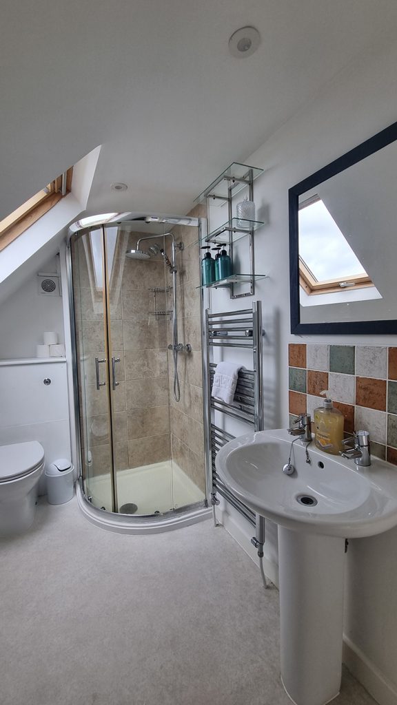 The bedroom incorporates a balcony with views over Chalice Hill, a spectacular view to wake up to. Other windows offer vistas of the town and Wearyall Hill, home to Joseph of Arimathea’s Holy Thorn tree believed to have grown when Joseph planted his staff upon alighting in Avalon. The view extends beyond Wearyall to the levels, sometimes hidden by the mists of Avalon.