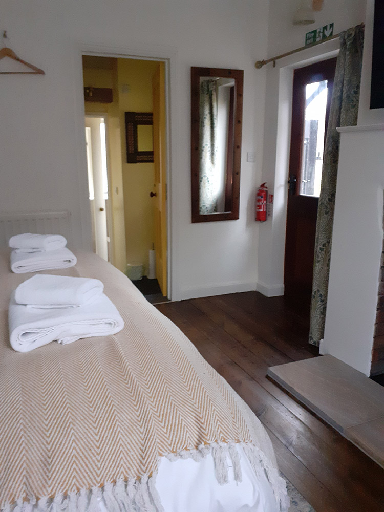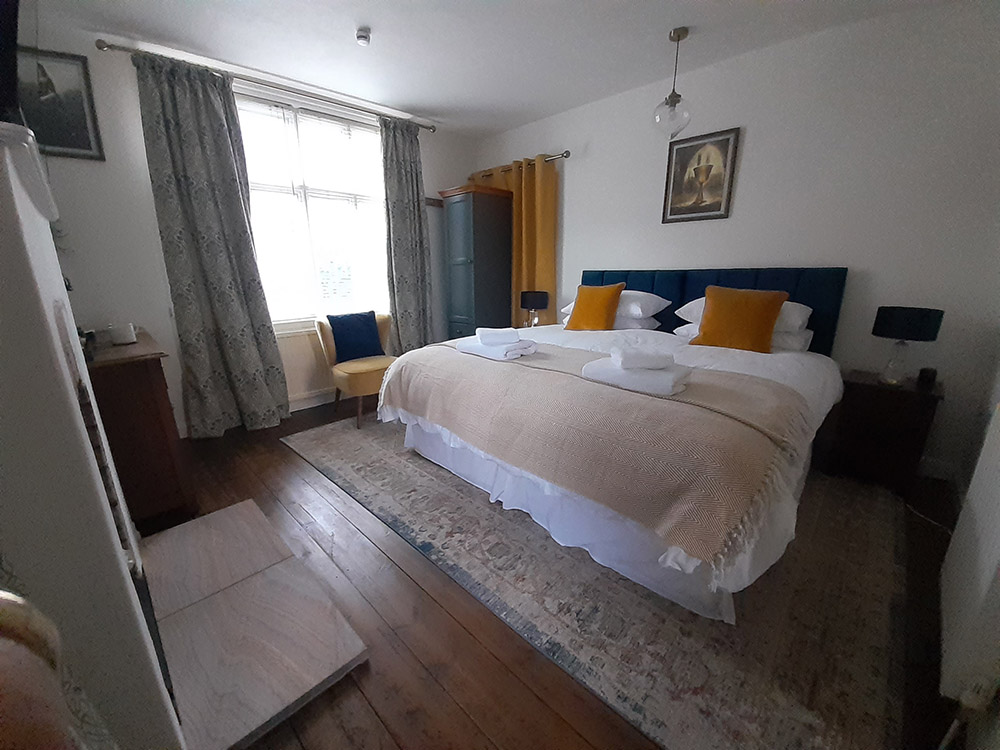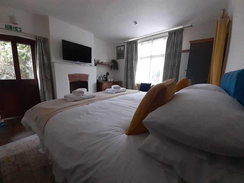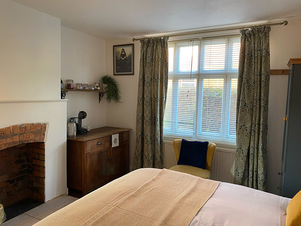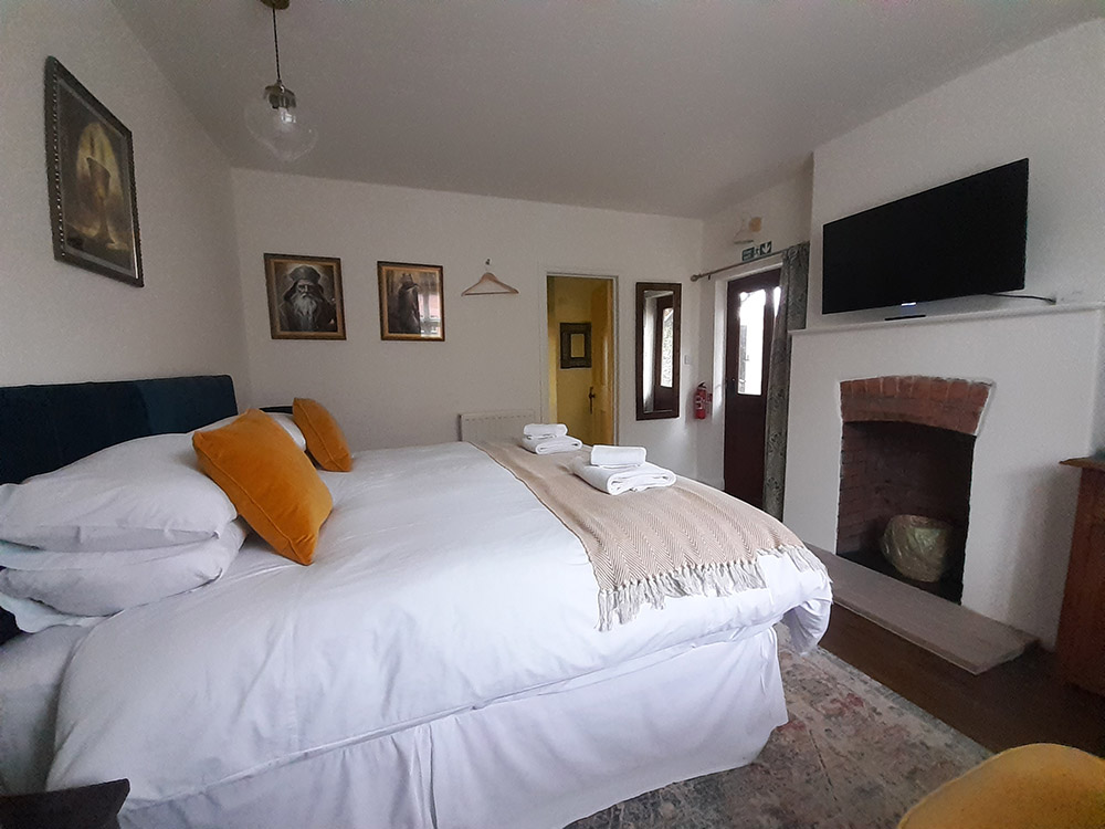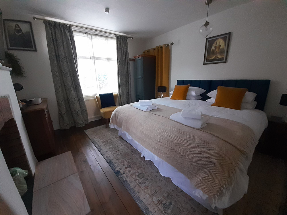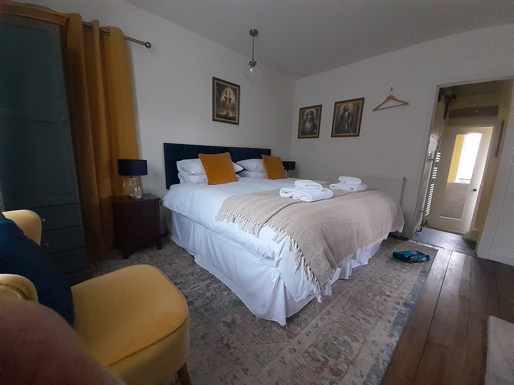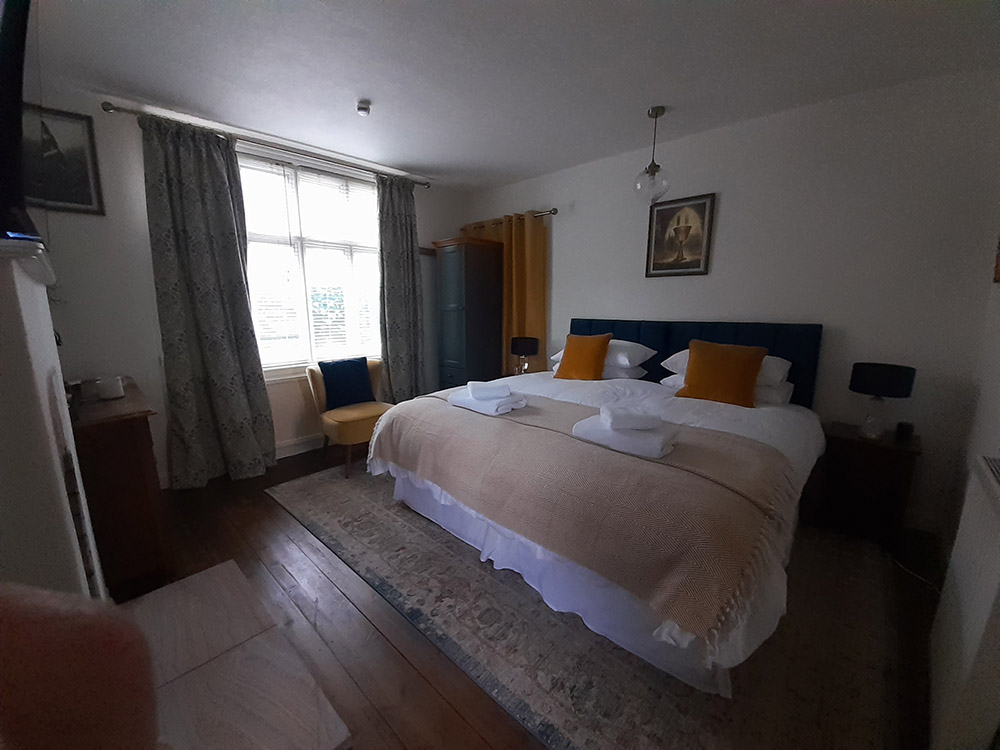 A separate room, with its own front door attached to a family home in Grail Cottage, with personal access and parking. The beautifully decorated Grail Room with ensuite shower room and toilet, a large comfortable super king-sized bed, TV and Bluetooth speaker for your use.